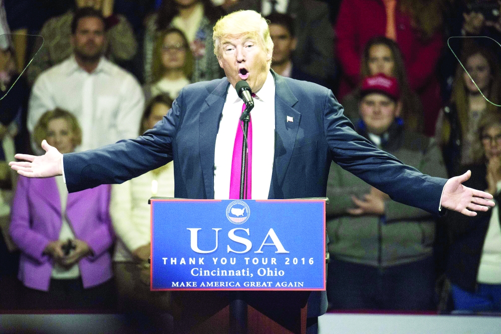 ترمب يتحدث خلال توقف في البنك الأمريكي في مسينسيناتي بولاية أوهايو أمس الأول. (أ. ف. ب)
