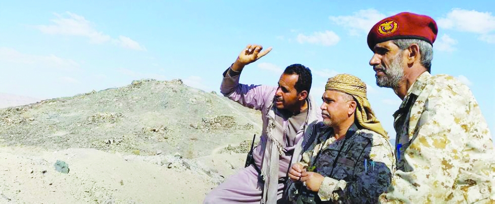 قائد عسكري مع قيادات للمقاومة على إحدى جبهات تعز. (عكاظ)