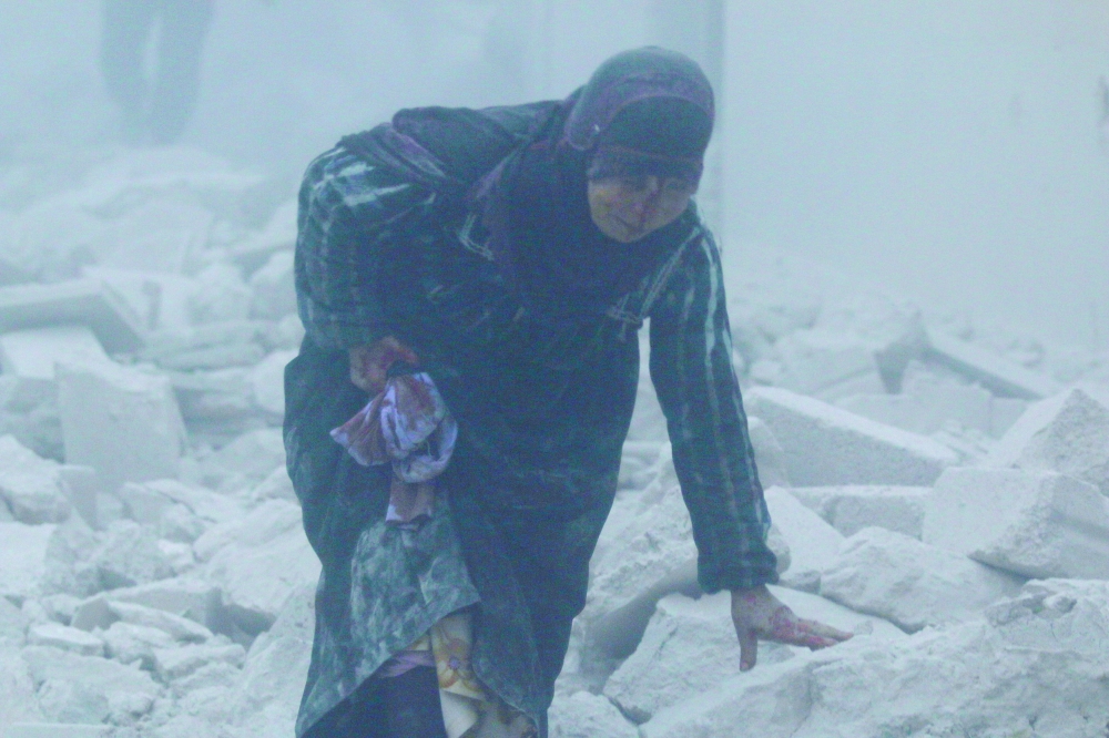 مسنة سورية عاجزة عن النهوض بعد غارات للنظام وروسيا على حلب أمس. (أ. ف. ب)