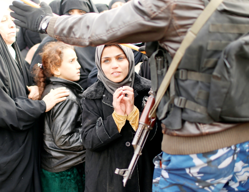 طفلة عراقية تختبى خلف والدتها بعد هروبهم من الموصل. (أ.ف.ب)