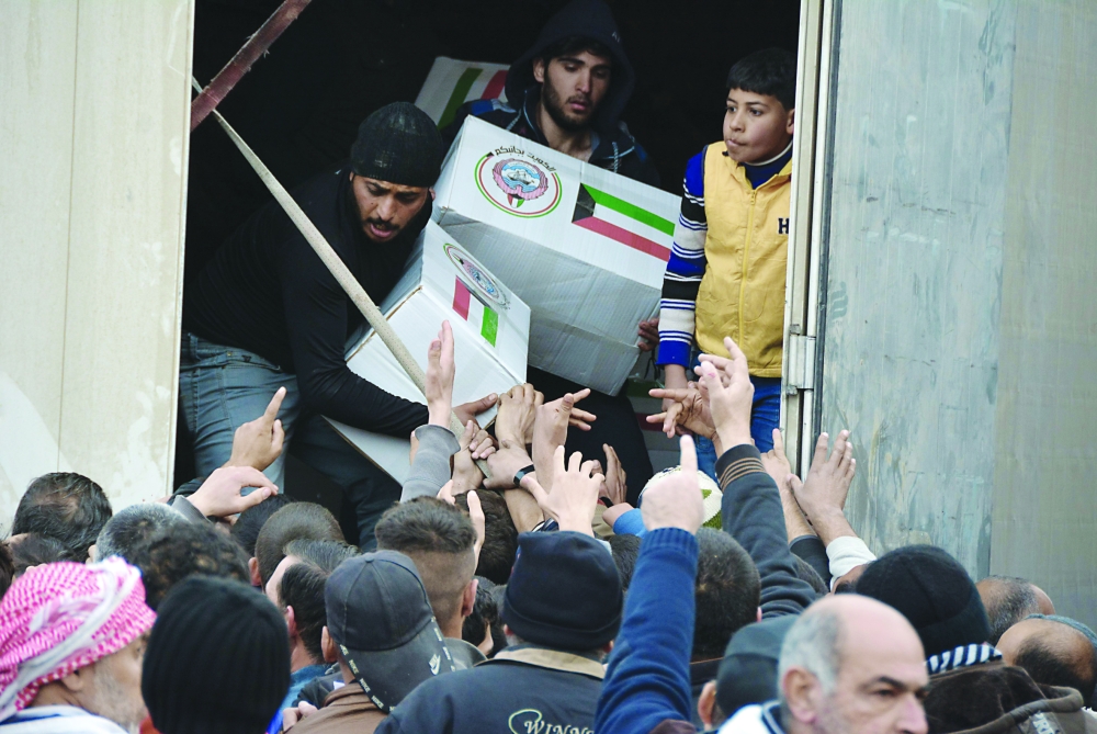 نازحون عراقيون يتلقون مساعدات غذائية في مخيم قرب الموصل أمس الأول. (أ. ف. ب)