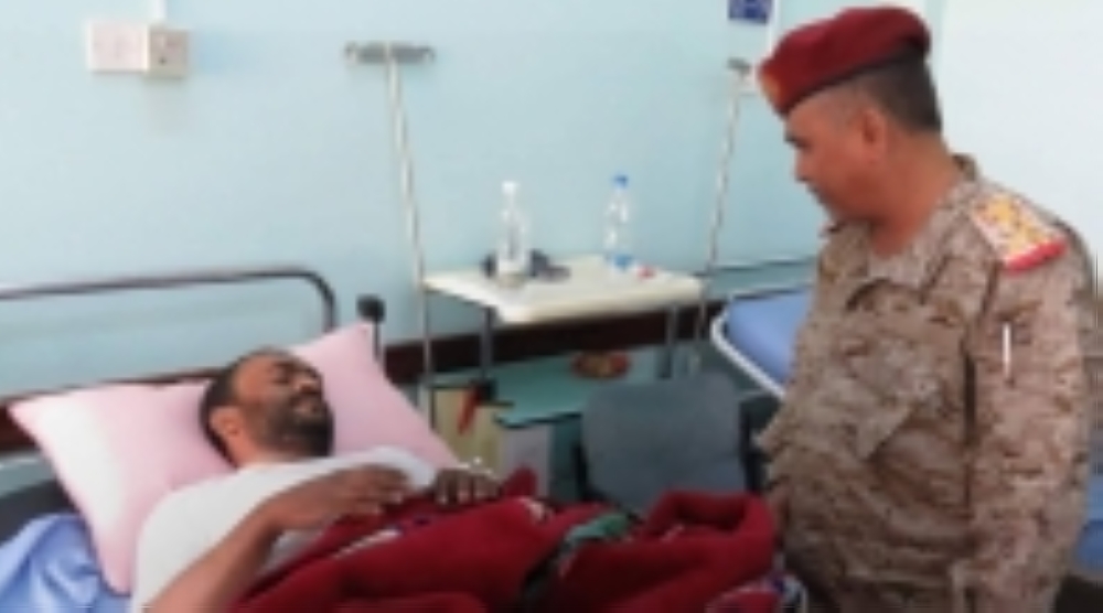 قيادي في الجيش اليمني أثناء زيارة جرحى مدنيين في تعز.