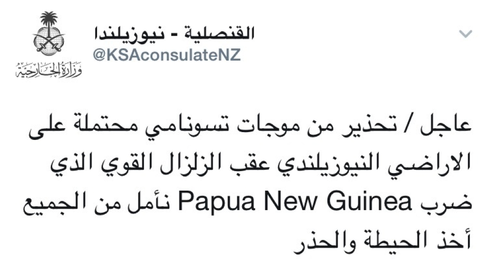 وقالت عبر حسابها بـ" تويتر" ‏عاجل تحذير من موجات تسونامي محتملة على الأراضي النيوزيلندية عقب الزلزال القوي الذي ضرب Papua New Guinea نأمل من الجميع أخذ الحيطة والحذر، وأضافت نأمل من جميع المواطنين الابتعاد عن الشواطئ ومتابعة آخر المستجدات وعدم التردد بالاتصال على هاتف شؤون السعوديين
