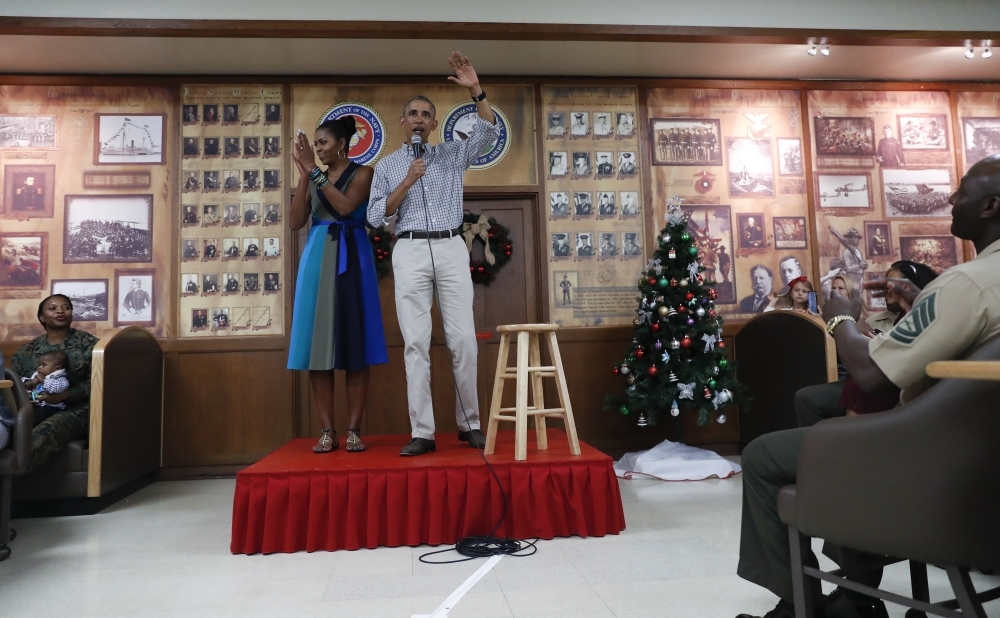 قام الرئيس الأمريكي، باراك أوباما وزوجته ميشيل، بآخر زيارة لهما إلى عسكريين وعائلاتهم يحتفلون بعيد الميلاد في قاعدة في هاواي وسط المحيط الهادئ.