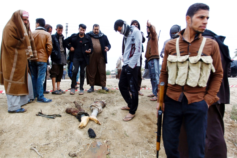 عناصر من الاستخبارات العراقية يعاينون أشلاء انتحاريي النجف، و«عكاظ» تعتذر لبشاعة الصورة. (أ.ف.ب)