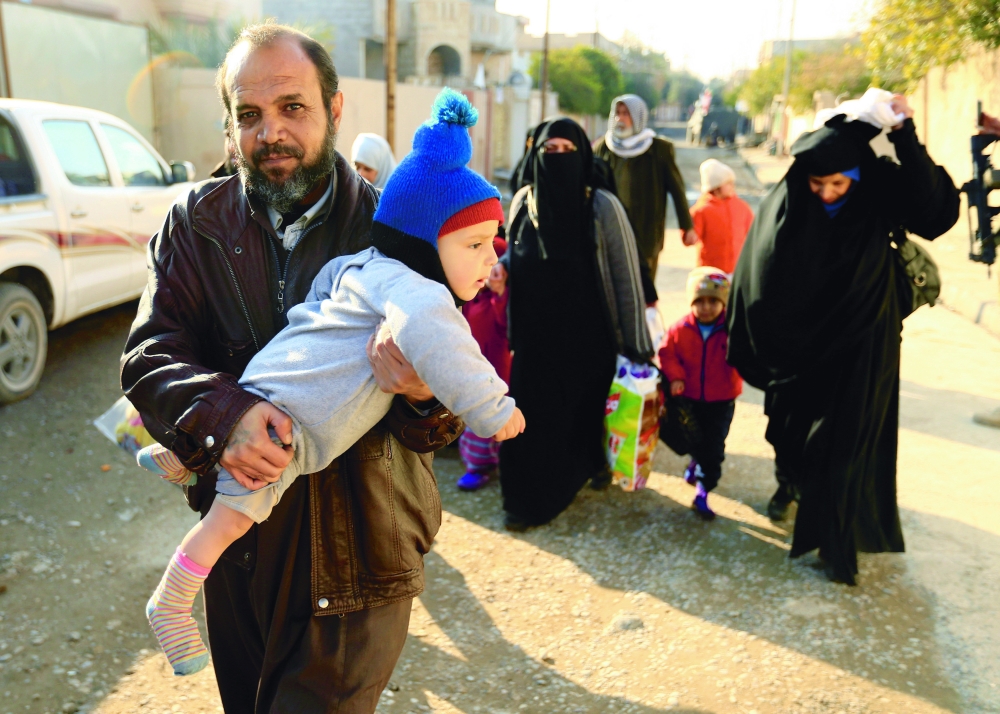 أسرة عراقية هاربة من جحيم جرائم الحشد الشعبي في الموصل. (أ. ف. ب)
