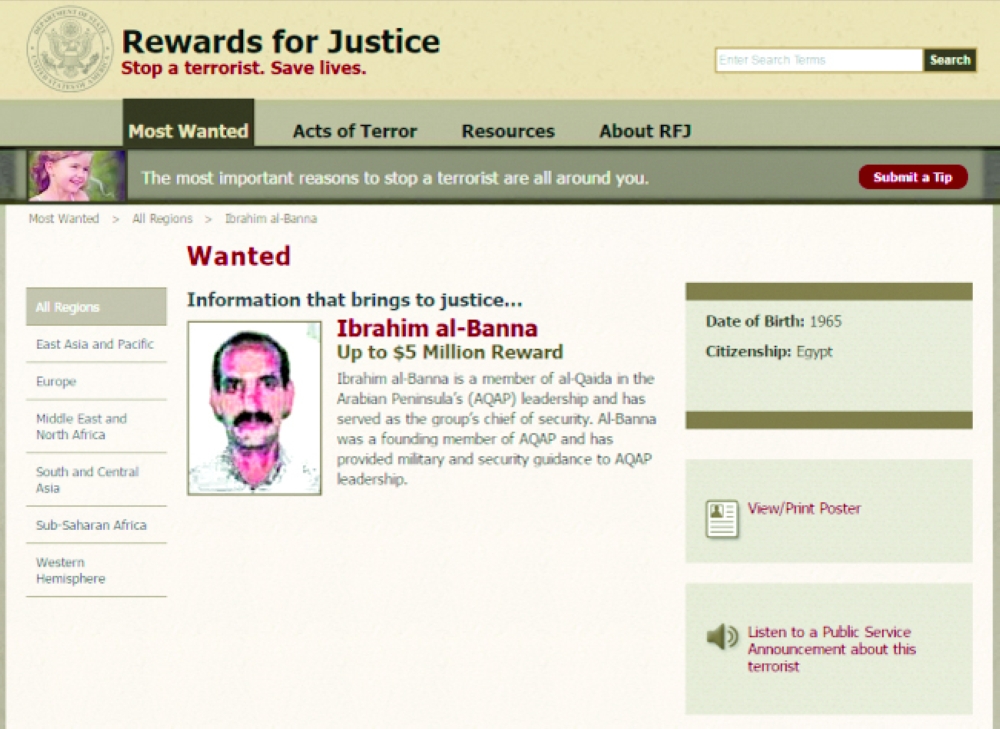 كشفت صحيفة وول ستريت جورنال الأمريكية أن الخارجية الأمريكية رصدت مكافأة قدرها خمسة ملايين دولار مقابل الإدلاء بتفاصيل عن مكان وجود القيادي في تنظيم القاعدة إبراهيم البنا (مصري الجنسية)، وأدرجته في قائمة الإرهابيين العالميين.