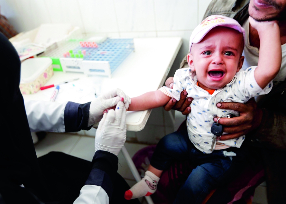 طفل يمني يعاني من نقص التغذية نتيجة حصار ميليشيات الحوثي في أحد المراكز الصحية خارج صنعاء. (أ.ف.ب)