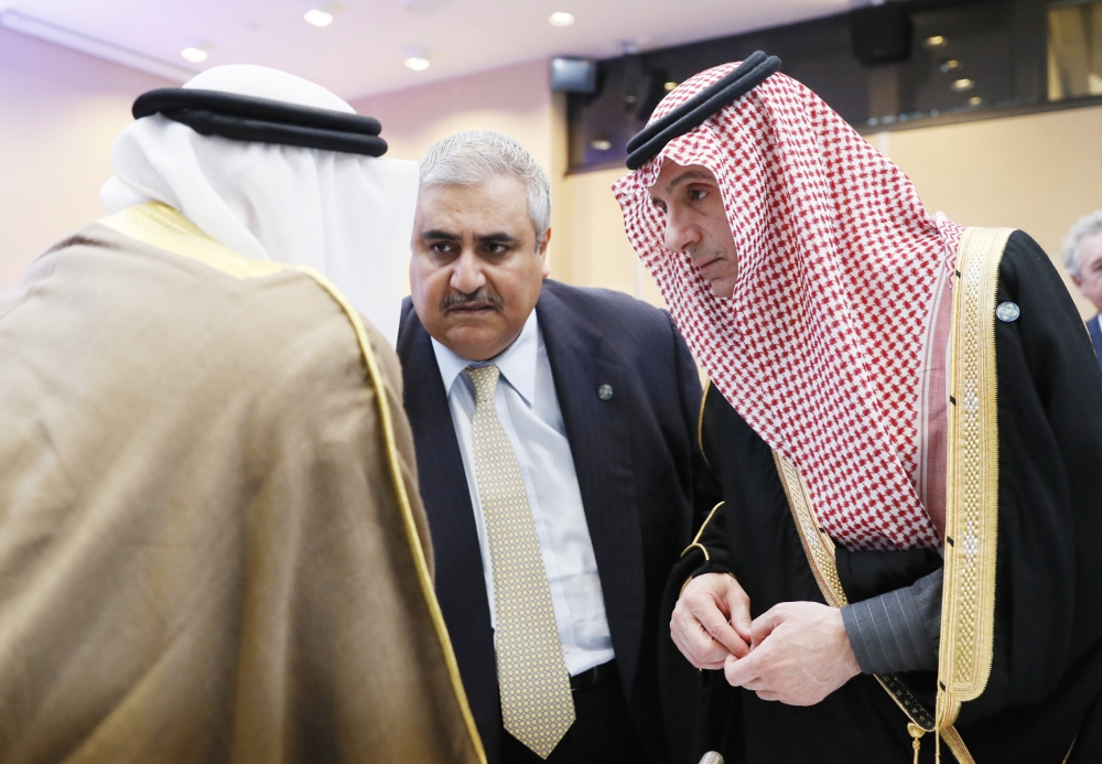 وزير الخارجية السعودي عادل الجبير مع نظيره البحريني في نقاش خلال مؤتمر السلام في باريس.