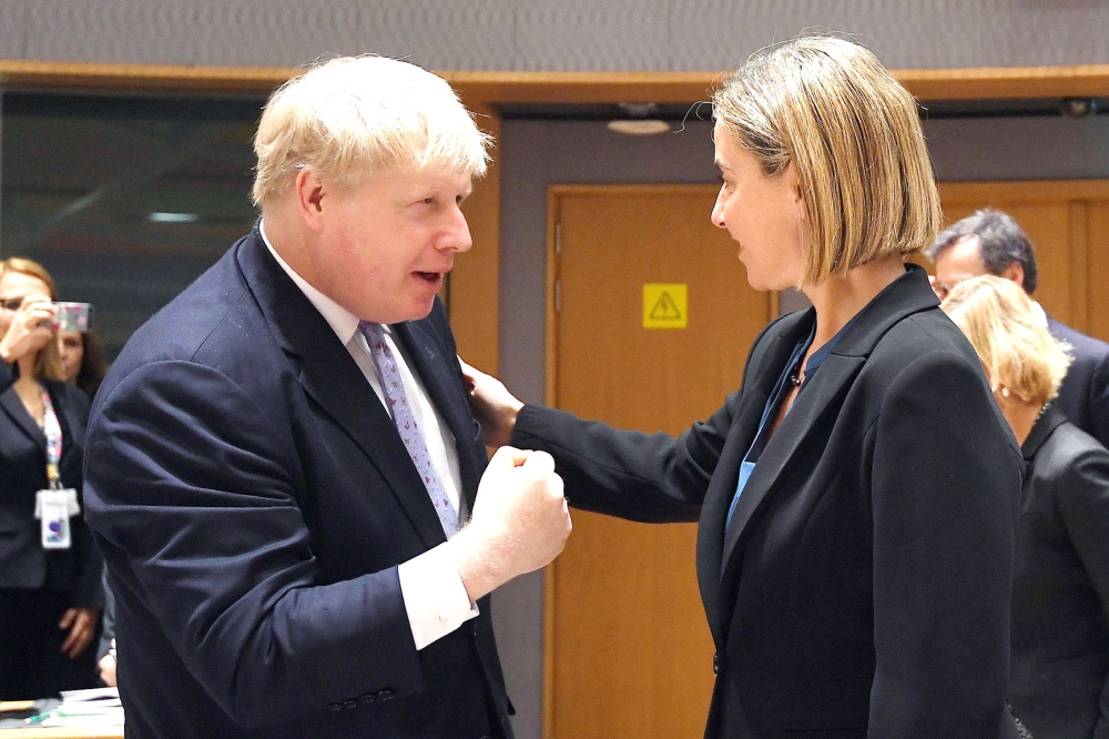 موغريني خلال حديثها مع وزير الخارجية البريطاني جونسون في بروكسل أمس. (أ ف ب)