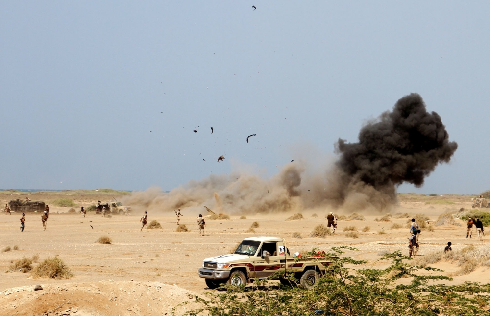 انفجار لغم قوات موالية للحكومة اليمنية في مدينة المخا أمس. (أ. ف. ب)