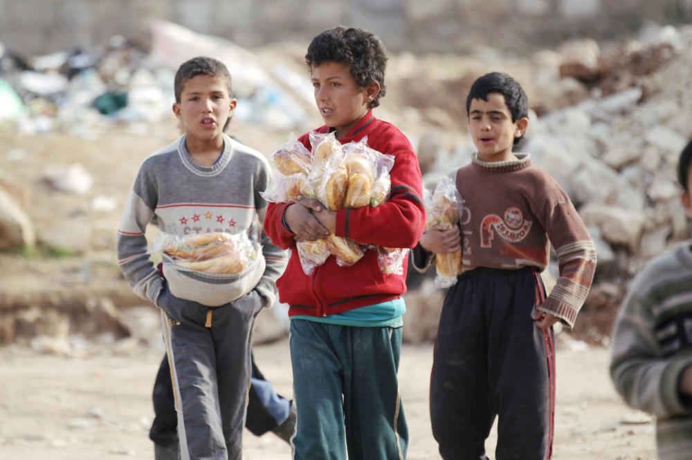 طفلان سوريان يحملان الخبز في قرية الراعي بريف حلب أمس الأول. (رويترز)