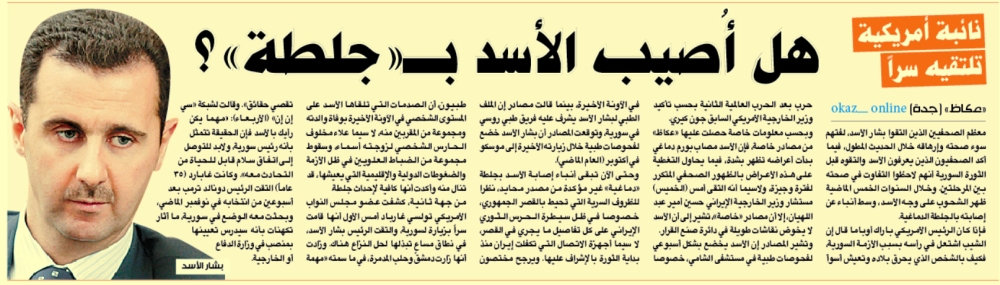وكانت «عكاظ» نشرت يوم الجمعة الماضي القصة المتكاملة حول جلطة الأسد، من خلال استطلاع آراء متخصصين طبيين، وشخصيات معارضة كانت مقربة من النظام قبل الثورة، ولم تستبعد أن يكون الأسد مصابا بجلطة دماغية، في ظل الضغوط النفسية والسياسية التي تعيشها البلاد.