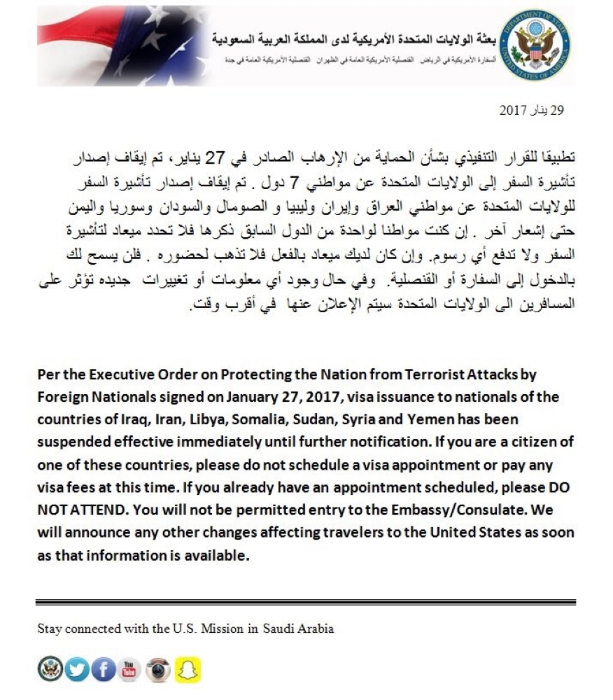 السفارة الأمريكية بالرياض تصدر بياناً حول قرار منع السفر لبعض الجنسيات