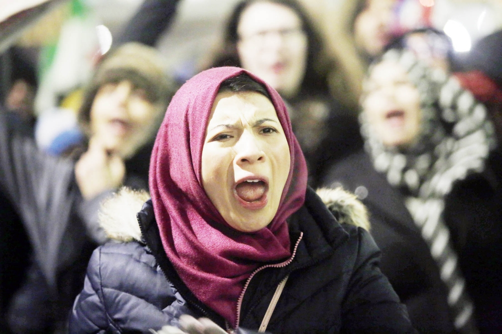 أمريكية مسلمة تصرخ خلال مظاهرة ضد قرار الرئيس ترمب. (أ.ف.ب)