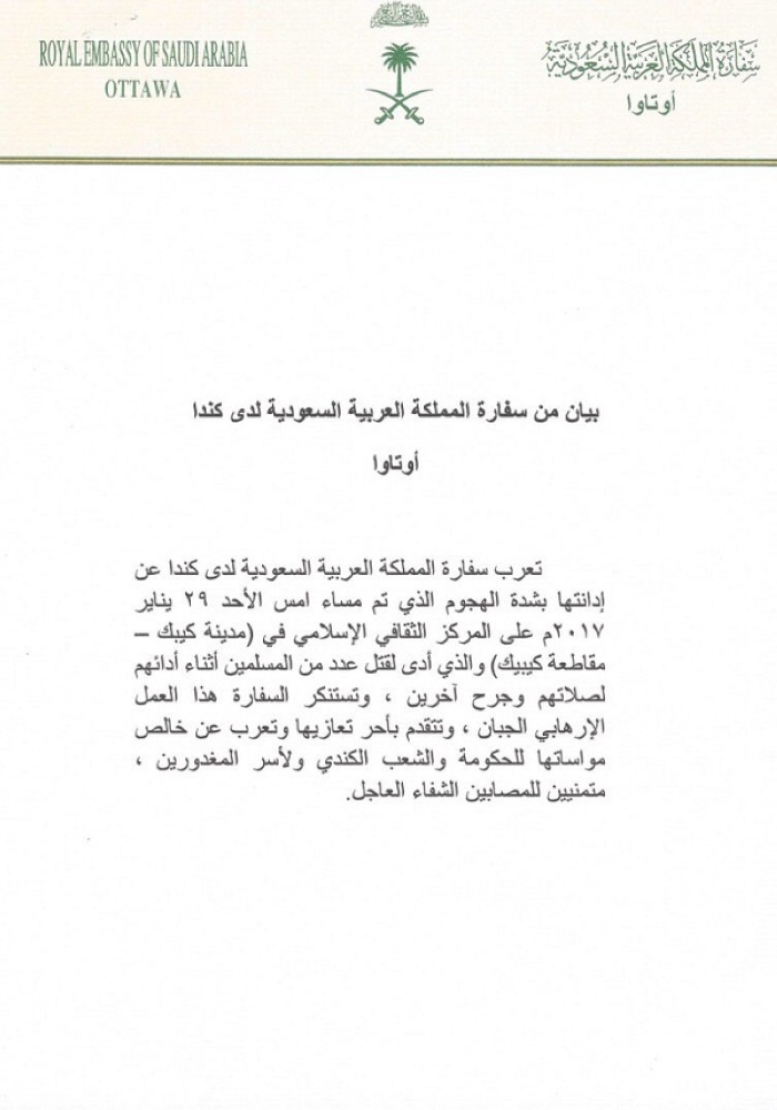 أدانت سفارة خادم الحرمين الشريفين في أوتاوا الهجوم على مسجد مدينة كيبيك. وقالت في بيان نشرته على حسابها الرسمي في (تويتر)، إن سفارة المملكة لدى كندا تعرب عن إدانتها بشدة للهجوم على المركز الثقافي الإسلامي في كيبيك الذي أدى لقتل عدد من المسلمين أثناء أدائهم صلاتهم وجرح آخرين، واستنكرت السفارة هذا العمل الإرهابي الجبان، مقدمة تعازيها ومواساتها للحكومة والشعب الكندي ولأسر المغدورين.