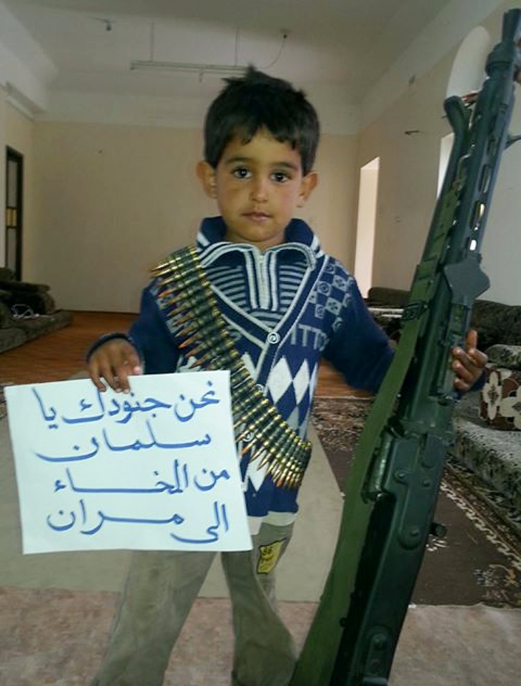 طفل يمني يحمل سلاح والده ولافتة كتب عليها «نحن جنودك يا سلمان من المخا إلى مران». (تصوير: عمر دوبلة)