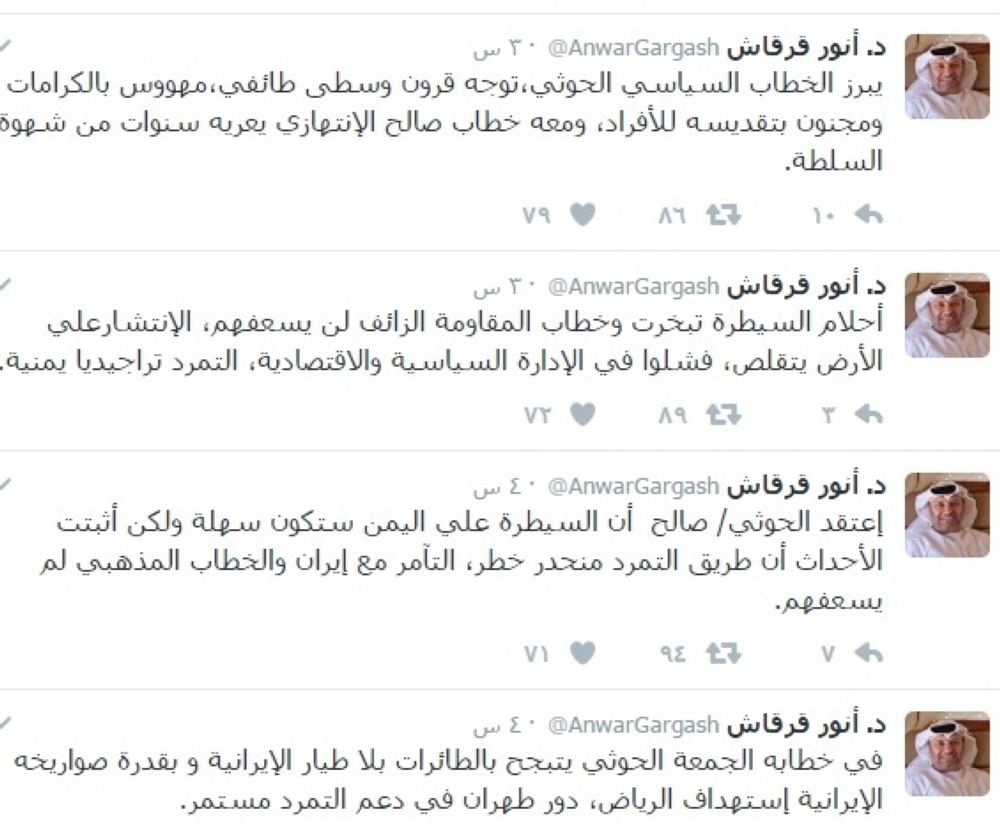 وقال قرقاش: أحلام السيطرة تبخرت وخطاب المقاومة الزائف لن يسعفهم، الانتشار علي الأرض يتقلص، فشلوا في الإدارة السياسية والاقتصادية، التمرد تراجيديا يمنية.. مضيفا: «اعتقد الحوثي وصالح أن السيطرة علي اليمن ستكون سهلة ولكن أثبتت الأحداث أن طريق التمرد منحدر خطر، خصوصا وأن التآمر مع إيران والخطاب المذهبي لم يسعفهم».