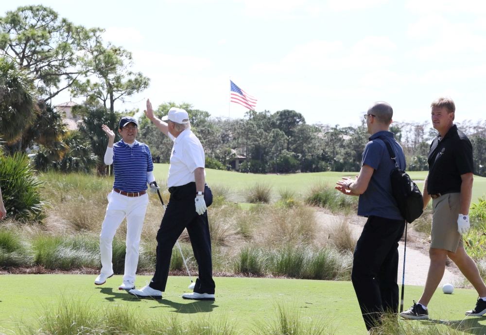 ترمب يمارس لعبة الجولف برفقة رئيس الوزراء الياباني في نادي ترمب للجولف في ولاية فلوريدا أمس. (رويترز)