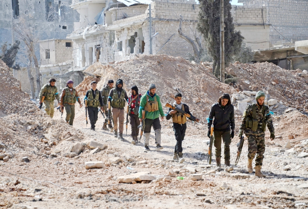 مقاتلون من قوات «درع الفرات» يتجهون إلى مدينة الباب السورية. (أ. ف.ب)