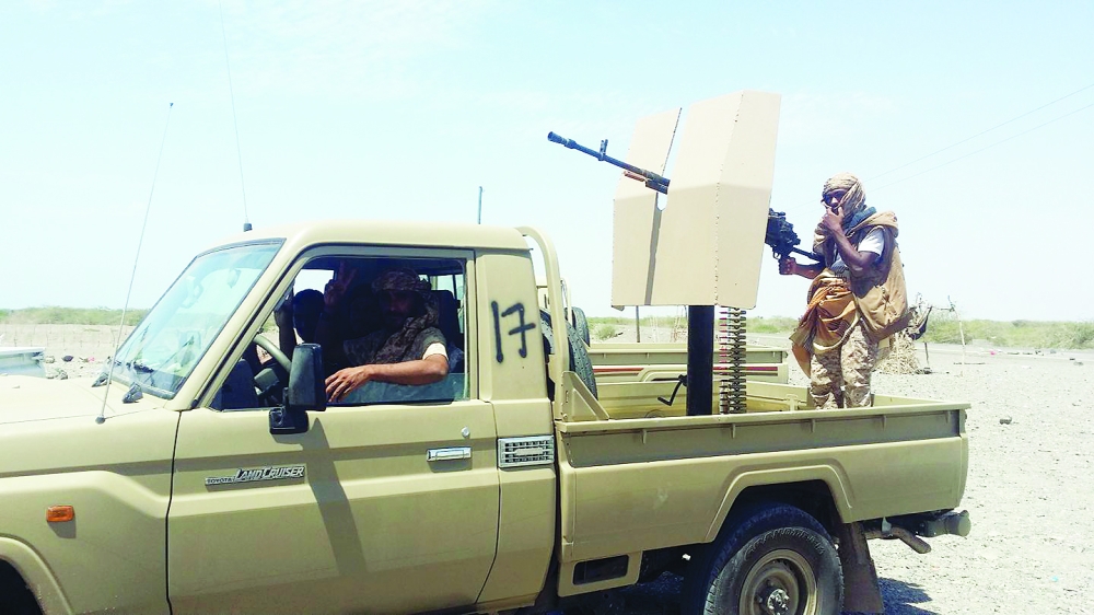 عناصر من الجيش اليمني على تخوم الحديدة أمس. (إعلام مقاومة الحديدة)