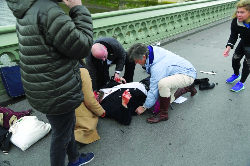 قتل ثلاثة أشخاص بينهم ضابط شرطة أمس (الأربعاء) في هجوم يشتبه أنه إرهابي أمام البرلمان البريطاني، فيما قتل منفذ الهجوم برصاص الشرطة.