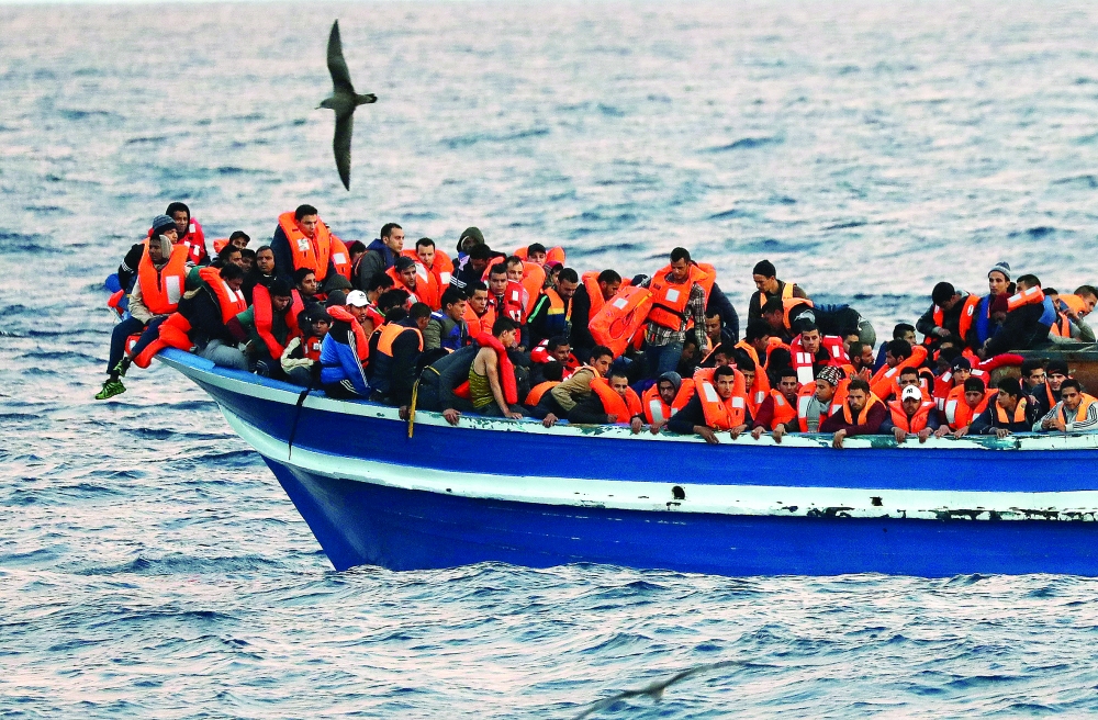 مركب للمهاجرين قبالة السواحل الليبية بحماية البحرية الإسبانية، بعد غرق 146 مهاجرا. (رويترز)