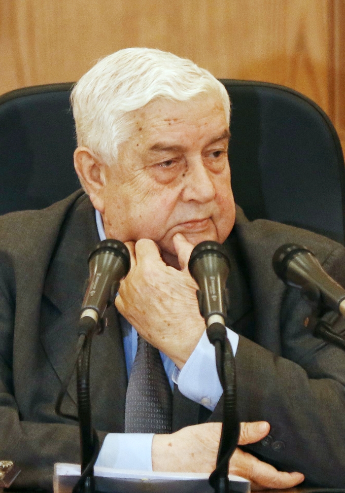Syrian Foreign Minister Walid Muallem looks on during a press conference in the capital Damascus on April 6, 2017. Syria's regime and Russia hit back at accusations that Damascus was behind a deadly chemical weapons attack, as pressure built for international action over what Washington called an «affront to humanity». / AFP / Louai Beshara