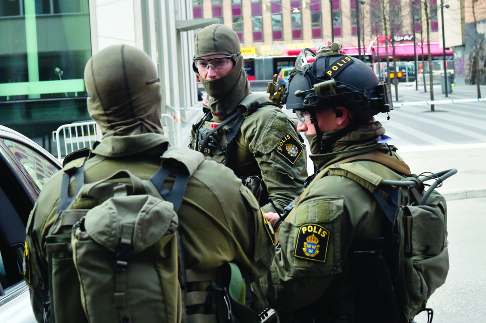 قوات الشرطة الخاصة فى مكان الحادث وسط ستوكهولم أمس. ( أ. ف. ب)