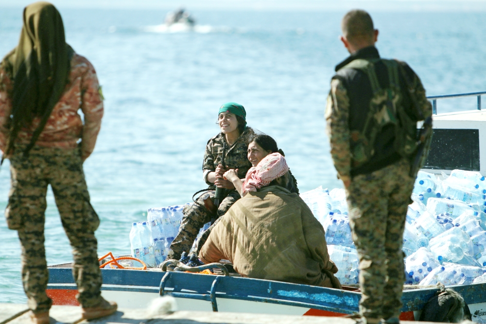 مقاتلتان من «سورية الديموقراطية» تنقذان لاجئين في البحر المتوسط. (أ.ف.ب)