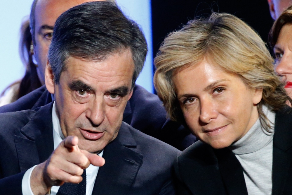 المرشح الفرنسي فيون مع أحد أعضاء حزبه. (أ. ف. ب)