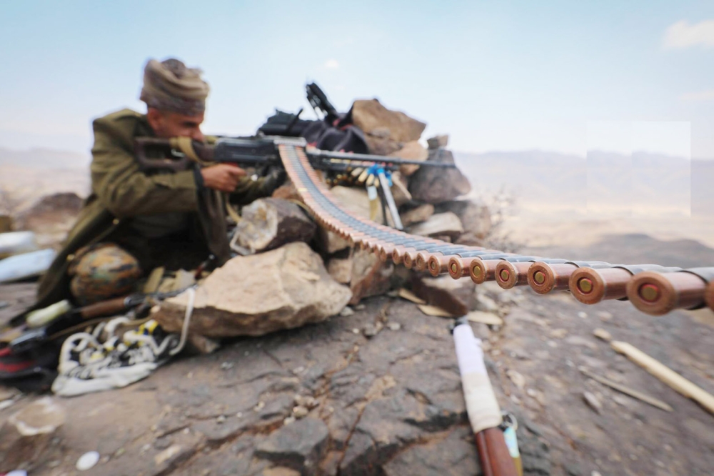 قيادي من الجيش الوطني أثناء المواجهات شرق تعز أمس. (تصوير: أحمد الباشا)