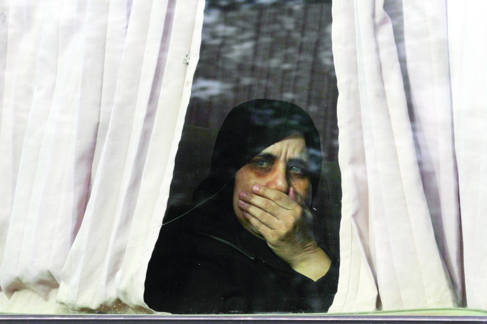 أسيرة سورية كانت محتجزة لدى النظام تبكي لدى وصولها إلى منطقة يسيطر عليها الجيش الحر في حلب أمس. (رويترز)