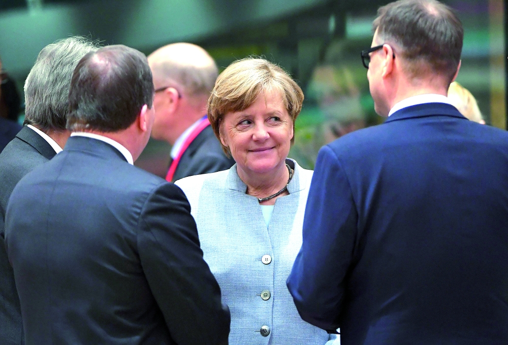 ميركل تتحدث مع كبار المسؤولين في اجتماع زعماء «الأوروبي» ببروكسل أمس. (أ ف ب)
