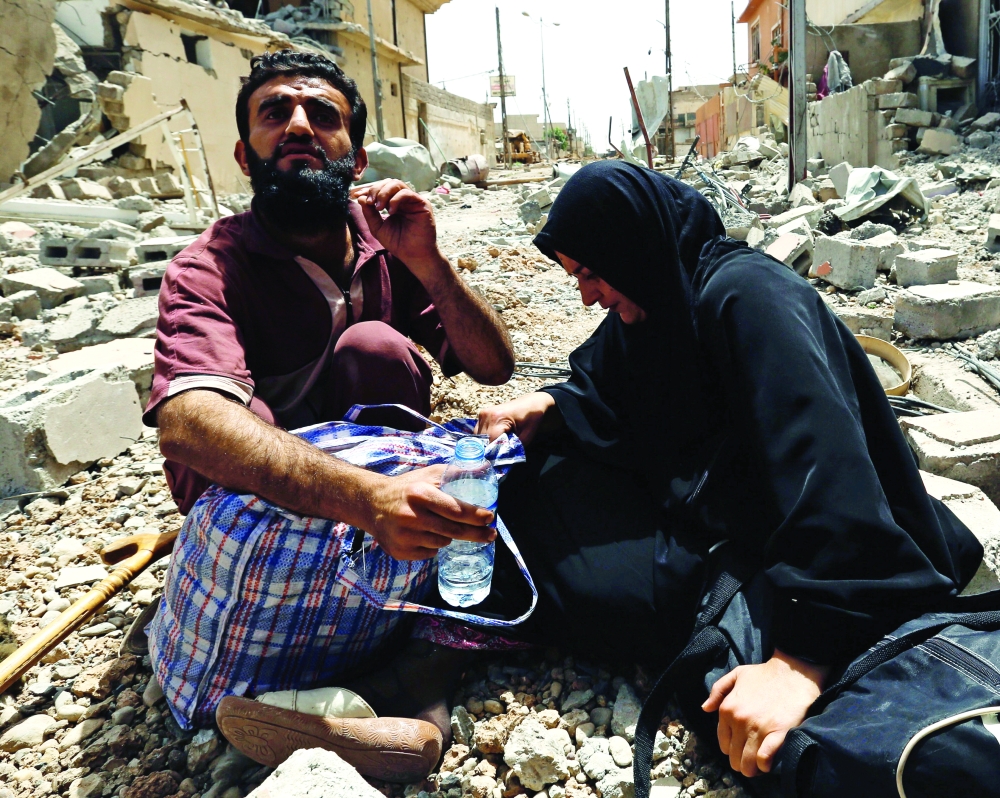 أسرة عراقية نازحة من الموصل أمس. (رويترز)