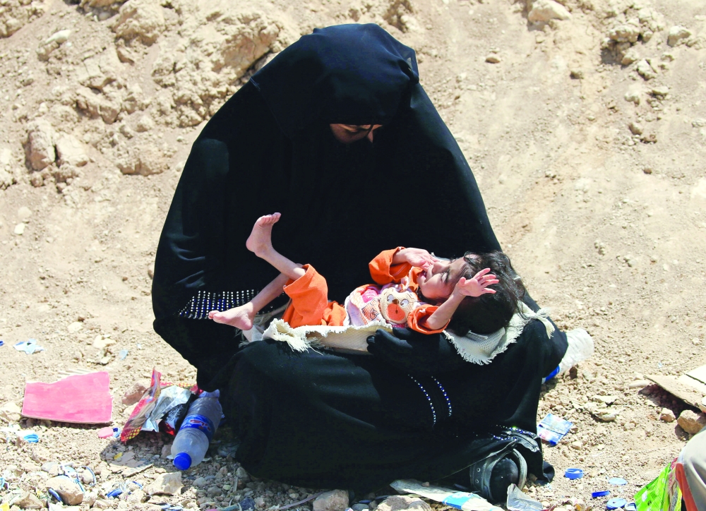 عراقية هاربة من المواجهات الدامية في الموصل تحمل طفلها الذي يعاني من سوء التغذية أمس.( رويترز )