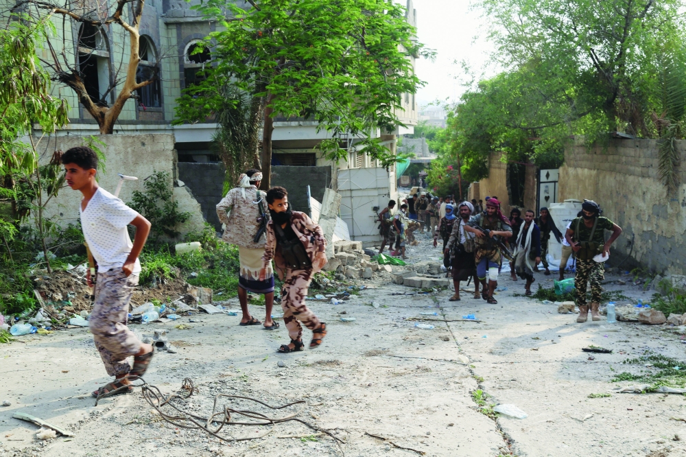 مقاتلون من الجيش الوطني أثناء السيطرة على القصر الجمهوري في تعز. (رويترز)