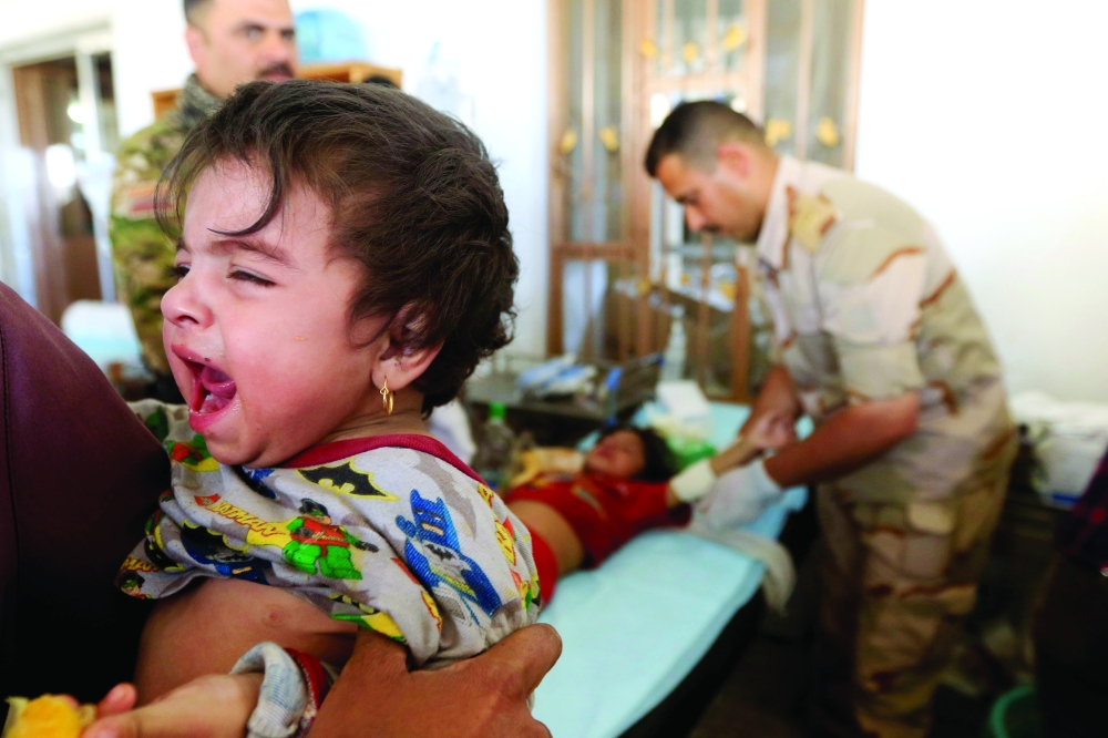 طفلة عراقية تبكي أثناء علاجها بعدما فرت مع أسرتها من الموصل أمس الأول. (رويترز)