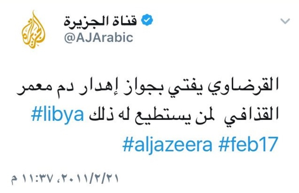 في تغريدة استعادها مغردون من حساب قناة الجزيرة القطرية في تويتر، أفتى فيها الزعيم الروحي لجماعة الإخوان "يوسف القرضاوي" المصنف ضمن القائمة السعودية الإماراتية البحرينية المصرية بالإرهابي، بجواز إهدار دم الزعيم الليبي الراحل معمر القذافي لمن يستطيع له ذلك