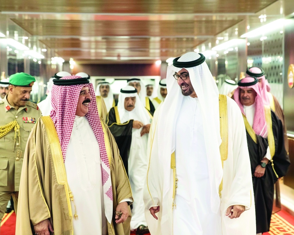 ملك البحرين لدى وصوله إلى أبوظبي وفي استقباله الشيخ محمد بن زايد. (وكالات)