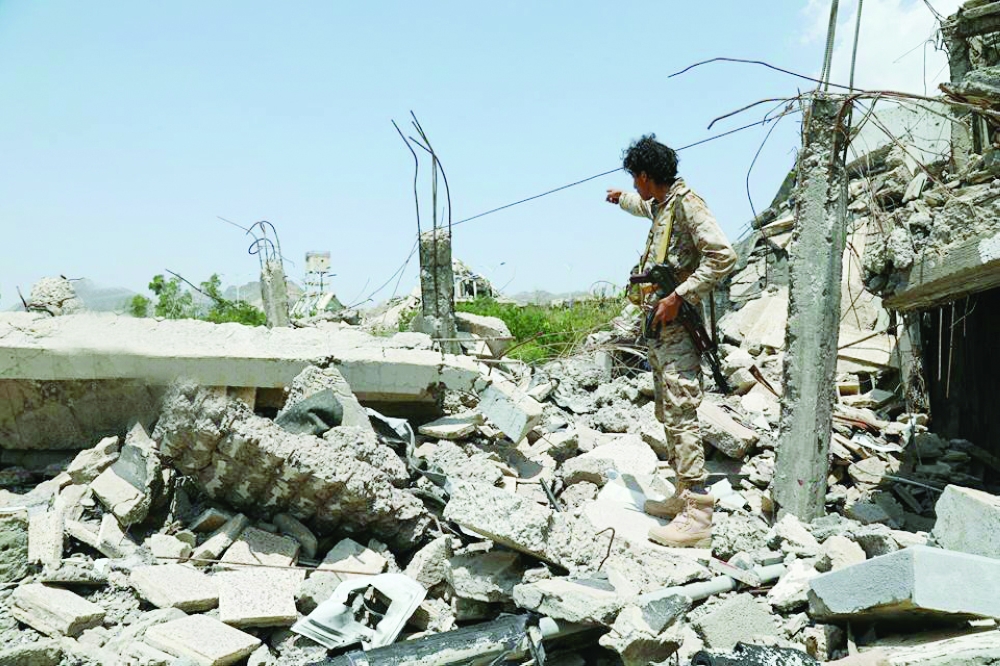 جندي يمني يشير إلى مواقع الانقلابيين من مبنى مدمر في تعز أمس. (أحمد الباشا)
