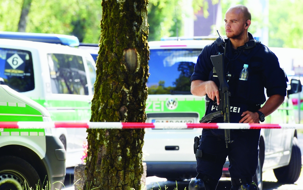 ضابط شرطة يؤمن مدخل محطة القطار بعد إطلاق النار في محطة قرب ميونيخ أمس. (أ ف ب)