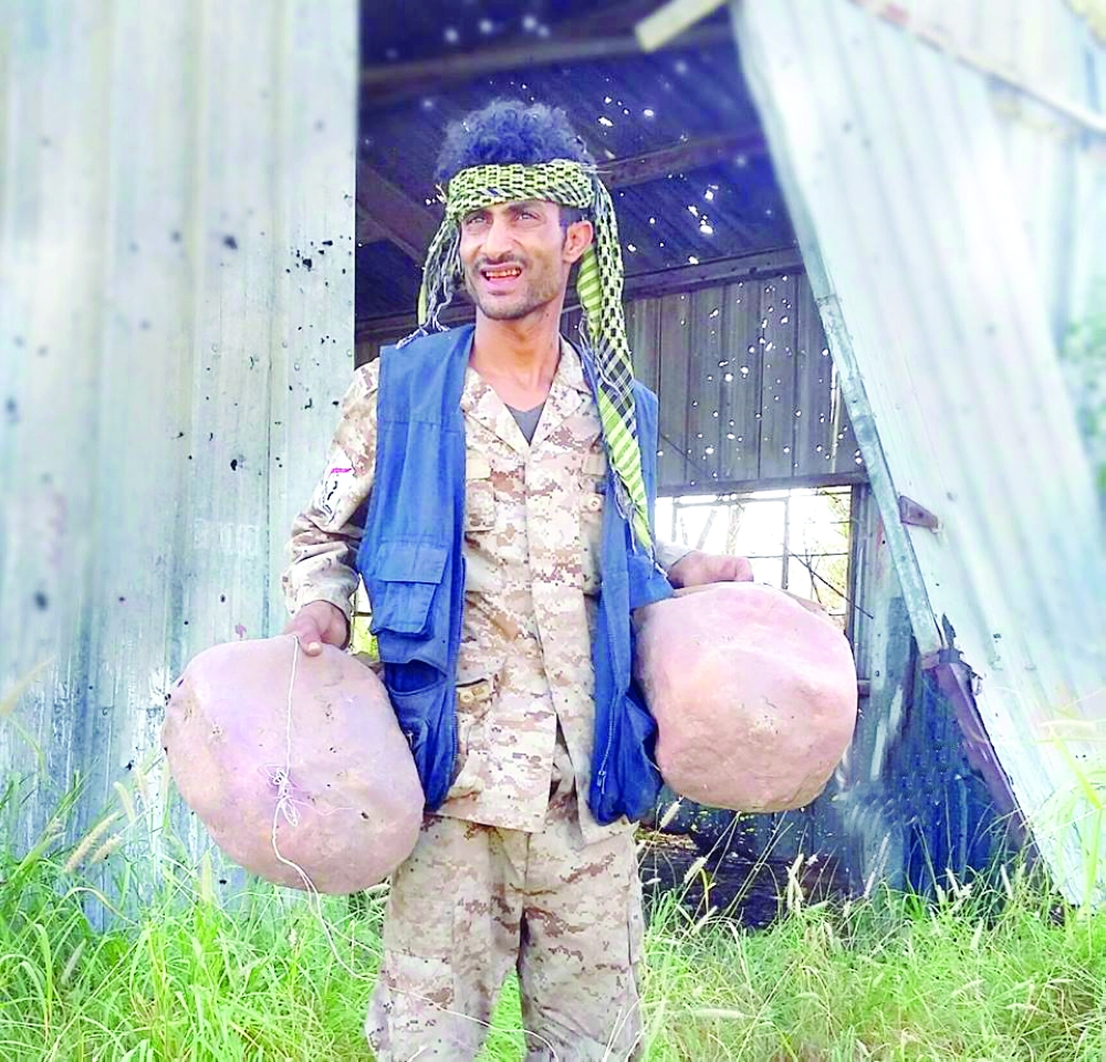 جندي يمني يحمل ألغاما حوثية فككت في شرق تعز. (متداولة)
