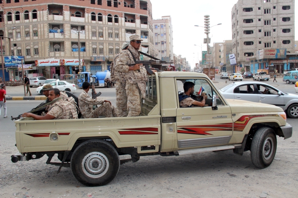 جنود يمنيون أثناء دورية في حي المنصورة بمدينة عدن أخيرا. (رويترز أرشيفية)