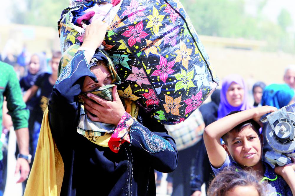 عراقية تحمل أغراضها أثناء فرارها من الموصل، فيما تواصل القوات العراقية مطاردة فلول «داعش» أمس. (رويترز)