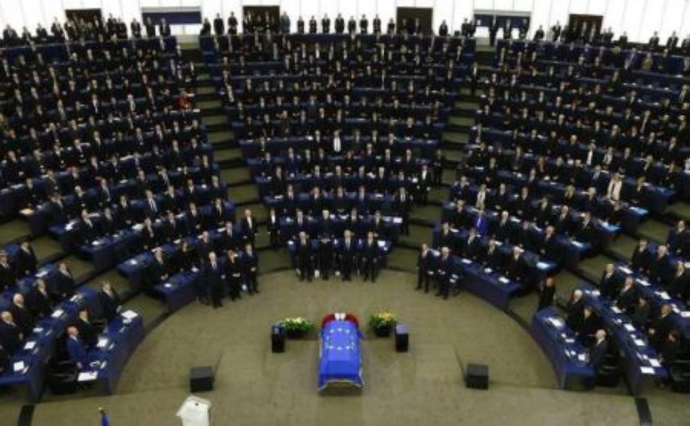 زعماء دول ومسؤولون خلال مراسم تأبين هلموت كول في البرلمان الأوروبي بستراسبورج اليوم السبت (رويترز).