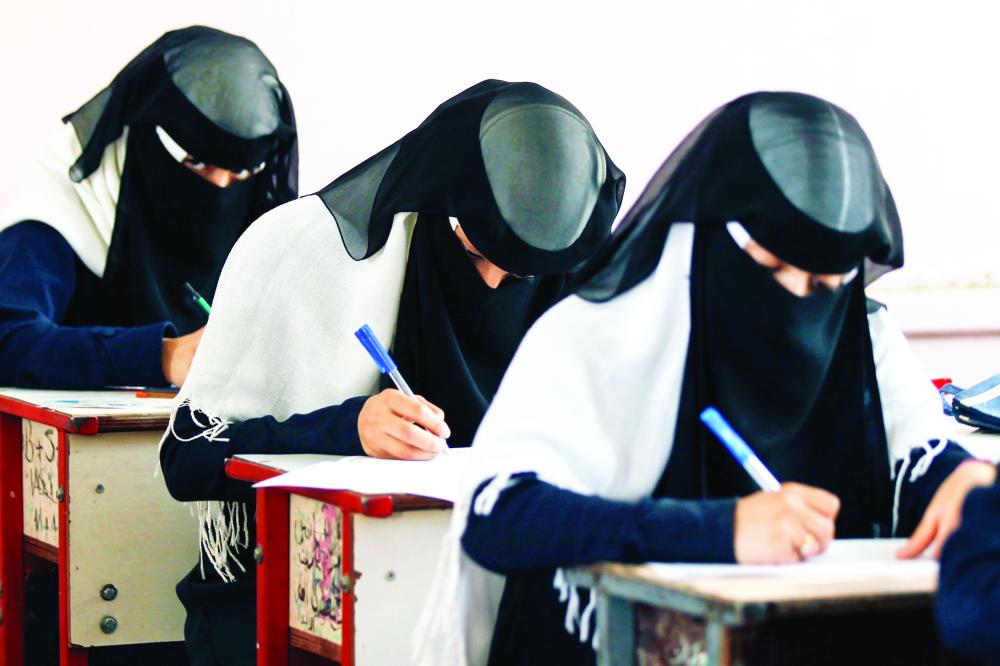 يمنيات يؤدين الاختبارات النهائية في إحدى المدارس الثانوية في صنعاء. (أ.ف.ب)