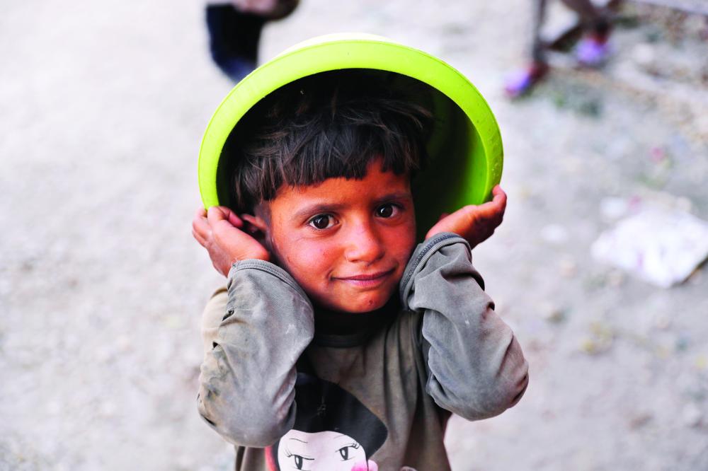 طفل سوري نزح مع عائلته من الرقة ينتظر دوره للحصول على الطعام في مخيم للاجئين شمال سورية أمس الأول. (أ. ف. ب)