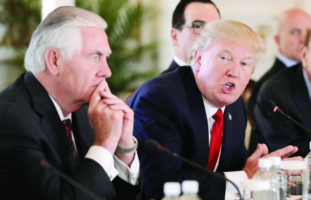 ترمب في لقاء سابق مع تيلرسون الذي يبدو متجهماً. (أ. ف. ب)