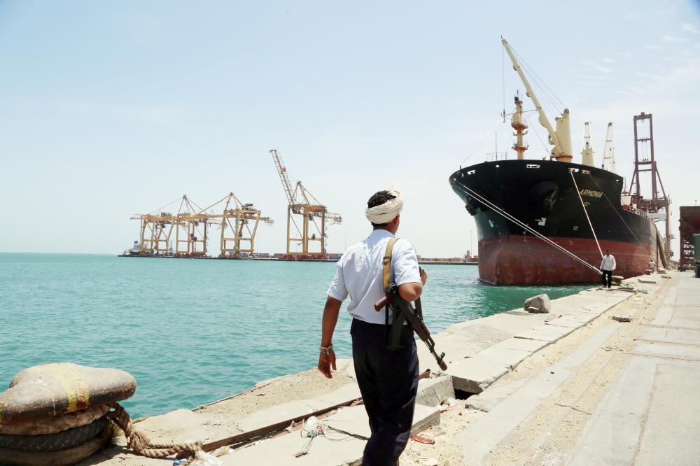 حوثي يتجول في ميناء الحديدة الذي تتخذه الميليشيات مركزاً عسكرياً. (رويترز)